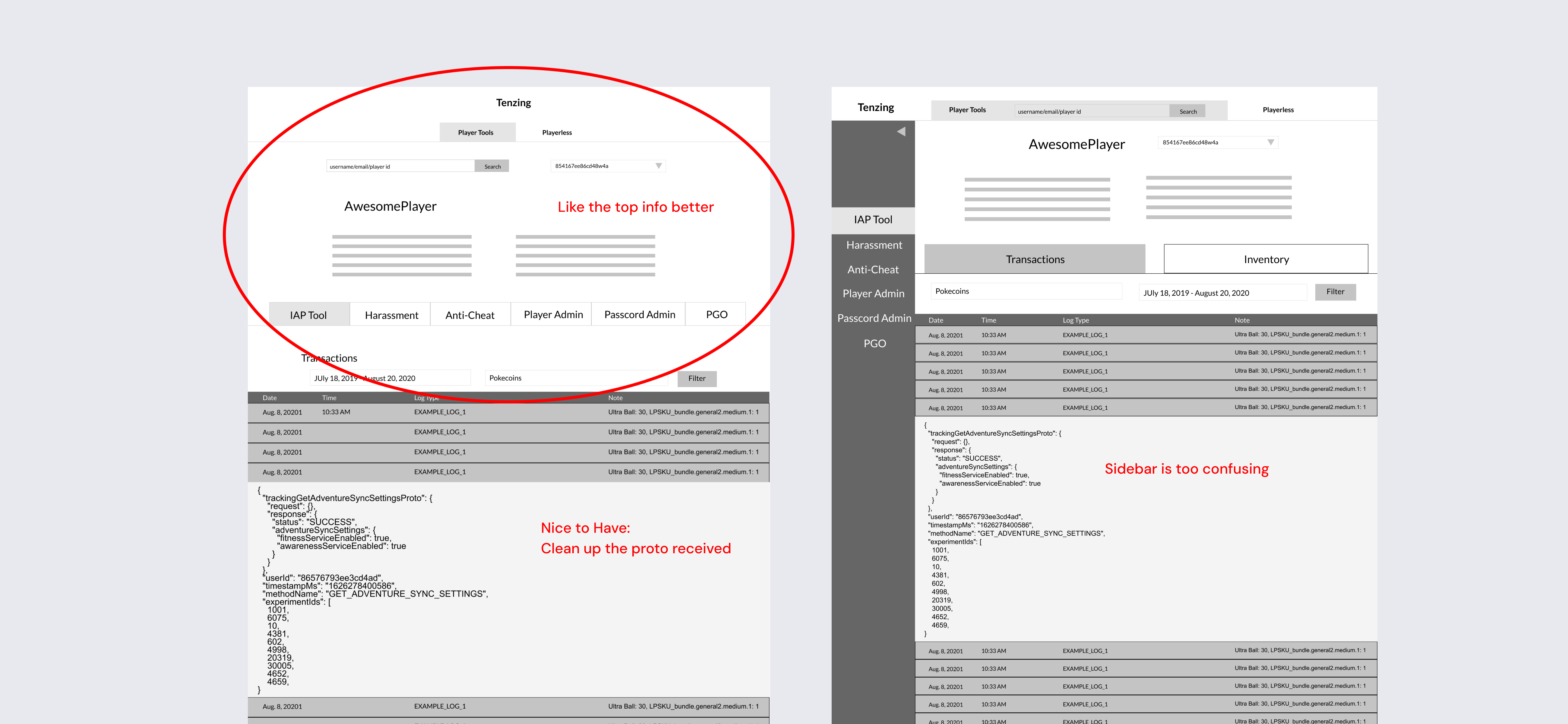 From the interviews, contractors spend the majority of their time reading logs. For instance, if a user claims their purchase didn't go through, the contractor will read through the logs to verify if a purchase transaction did happen as the user claimed. If true, then the contractor will grant the item to the user. Despite the majority of tickets required reading logs, the tool is terrible for reading. There's no filtering or searching. The pagination has no skip-to-page function, just next or back buttons. Worse, the pagination only displays 5 logs per page! Even the data displayed on log is too vague, unhelpful, or not logged at all.