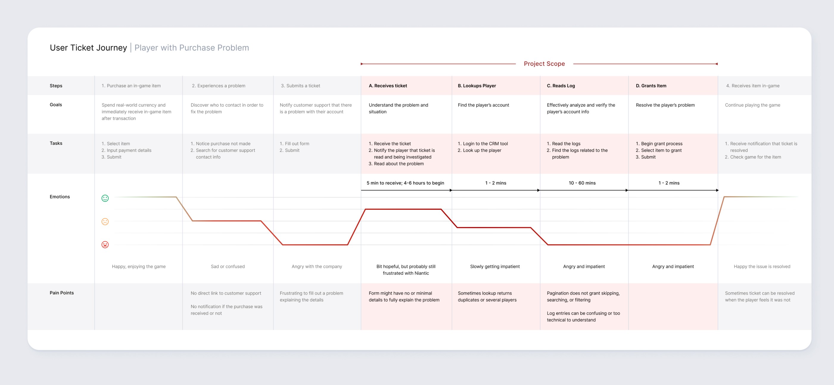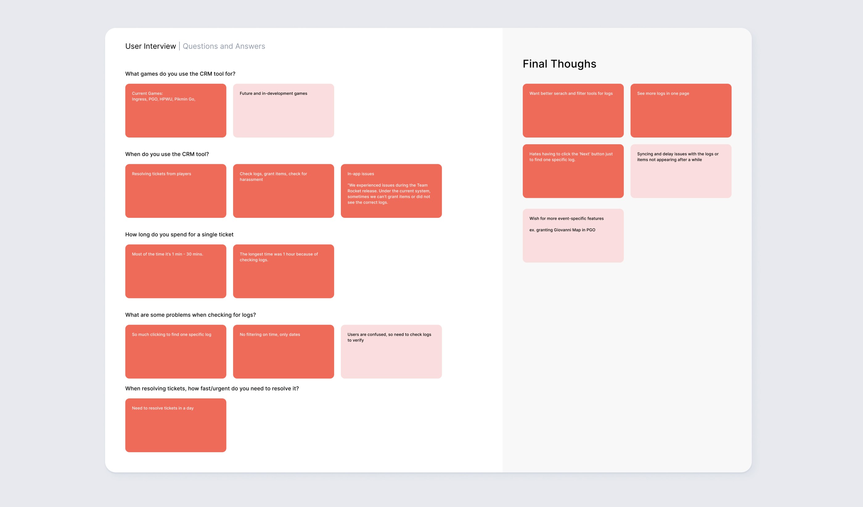 From reports, players are frustrated with how long it takes to resolve tickets. It seems the current design is preventing the CS team from resolving tickets faster. To prevent further loss in revenue, I decided to investigate and begin interviewing the CS team.