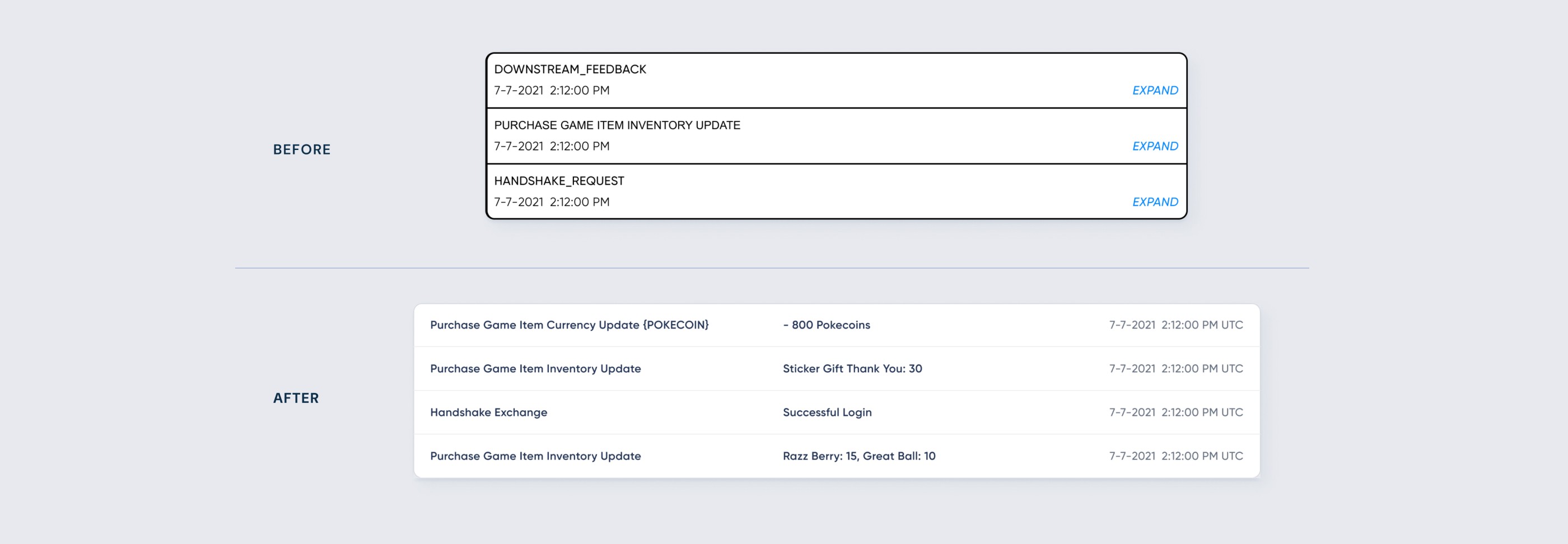 In the old design, the information inside the table item was vague and unhelpful. Often, a user had to click the item to display more detailed and clear info. The lack of useful info prevents the CS from skimming and quickly reading through logs, thereby extending the ticket resolution time. In the new design, I made sure the most important info was displayed, with clear wording on what it is. Thus, allowing the CS team to skim and read through the many logs, cutting down on the ticket resolution time.