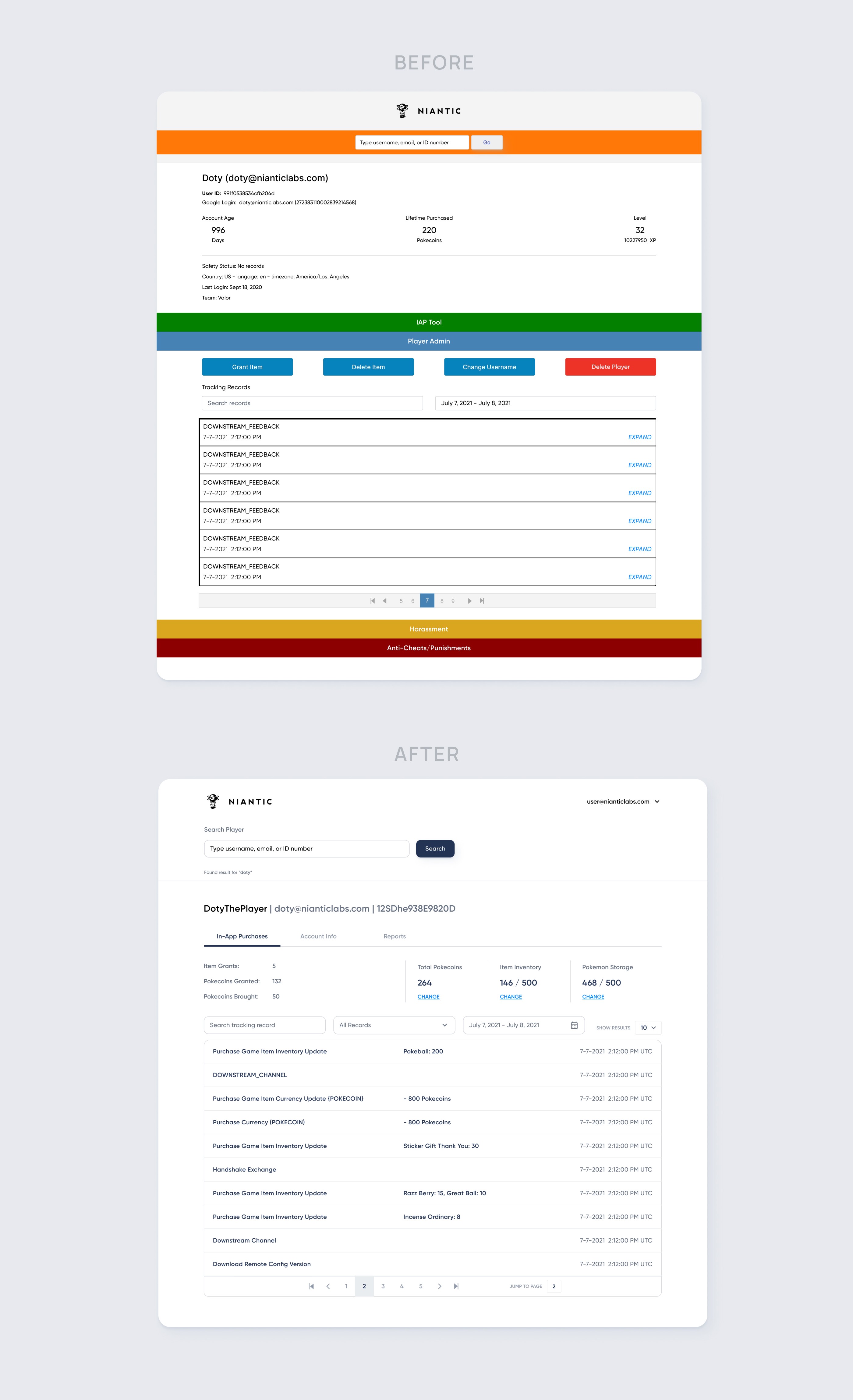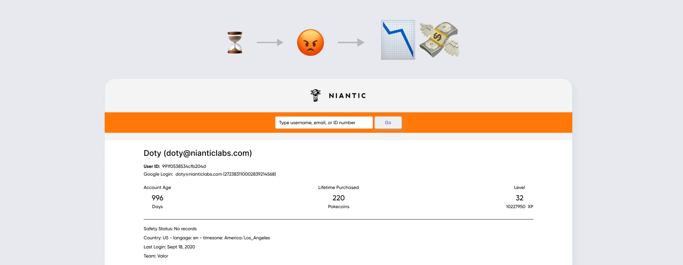 Many Pokemon Go players submit customer support tickets to resolve issues they experienced in their game or account. The customer service team uses an internal CRM tool to help lookup a player's account info. For example, a player submits a ticket claiming their purchase wasn't redeemed. Then a customer service representative uses the CRM tool to look at the player's account, verifying that the player did make a purchase. If purchase was found, the representative can grant the player the in-game item.