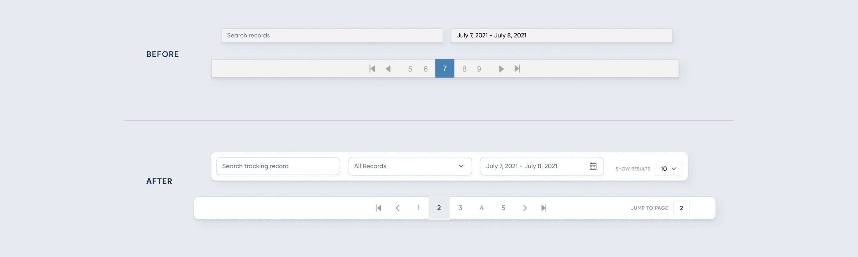 In the old design, skipping controls were limited. A user could only skip between the 5 nearest pages and the first/last page. From interviews, these limitations severely slowed down the CS team. In the new design, I created more skipping and searching options. Now a user can search, filter, and jump to pages on the pagination. Thereby, enabling more power to the CS team and faster ticket resolution.