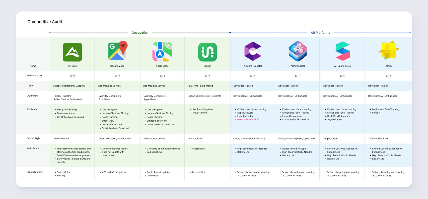 A competitive audit between two different product types: geospaital and AR. Interestedly Apple's ARCore offers a geospaital component in their AR kit.