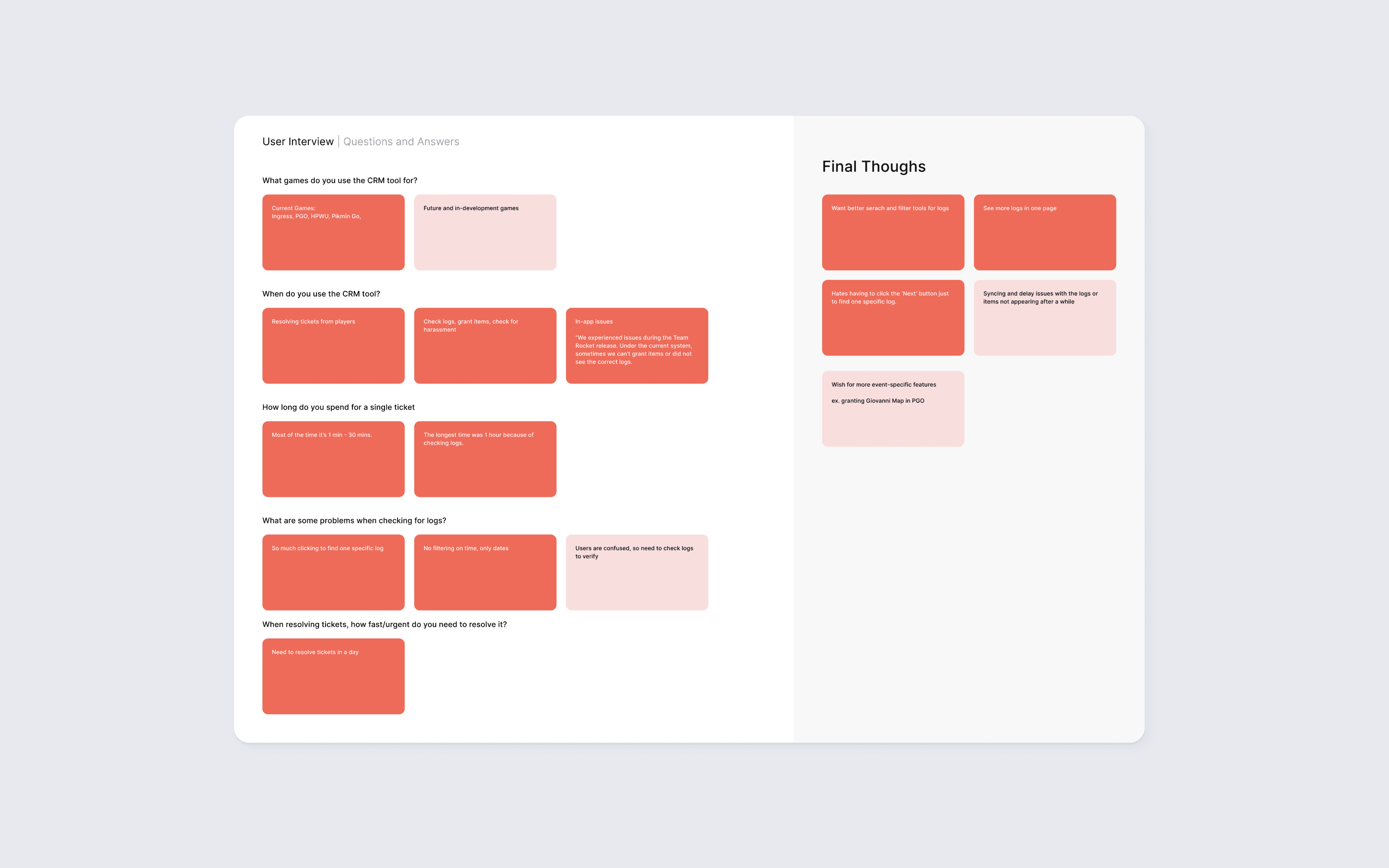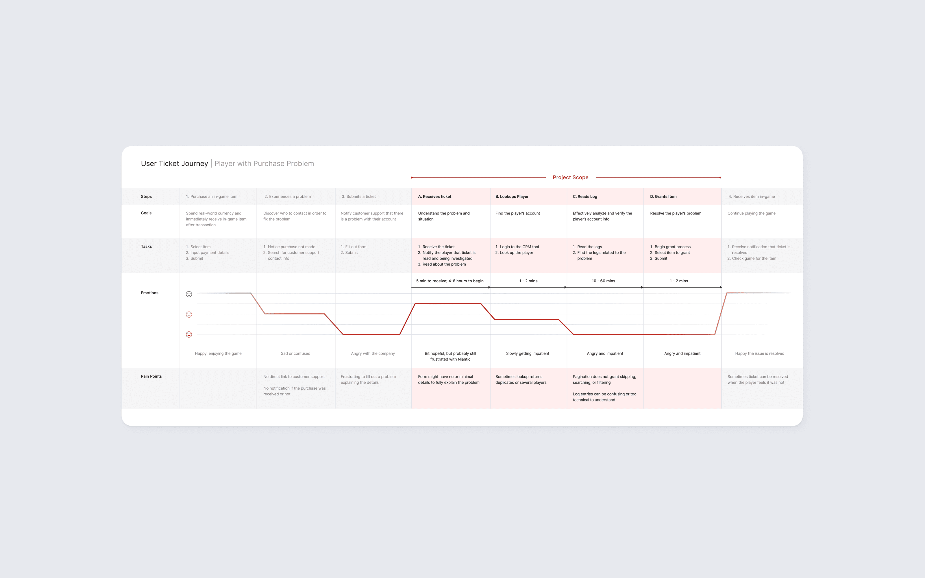 From reports, players are frustrated with how long it takes to resolve tickets. It seems the current design is preventing the CS team from resolving tickets faster. To prevent further loss in revenue, I decided to investigate and begin interviewing the CS team.