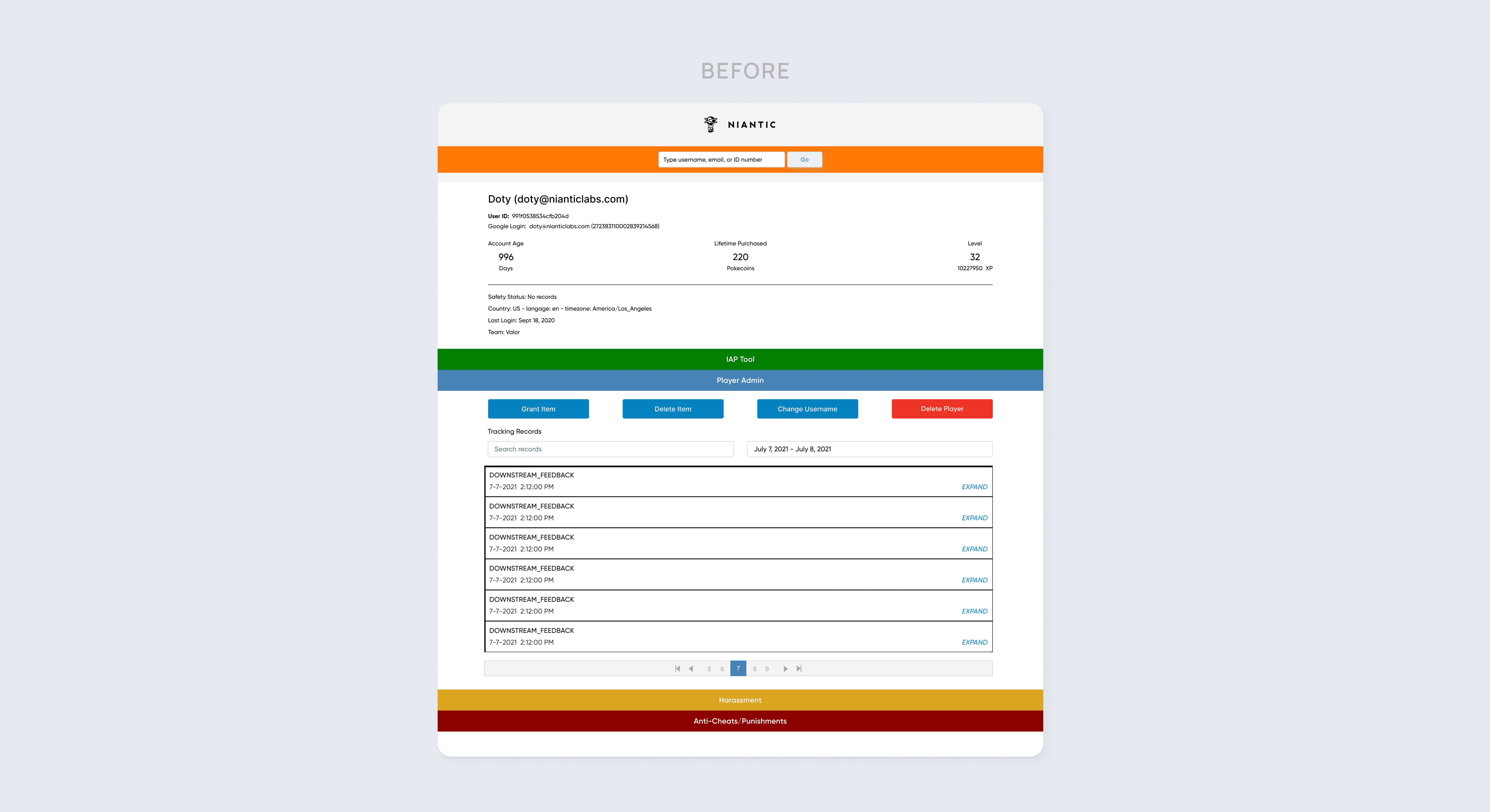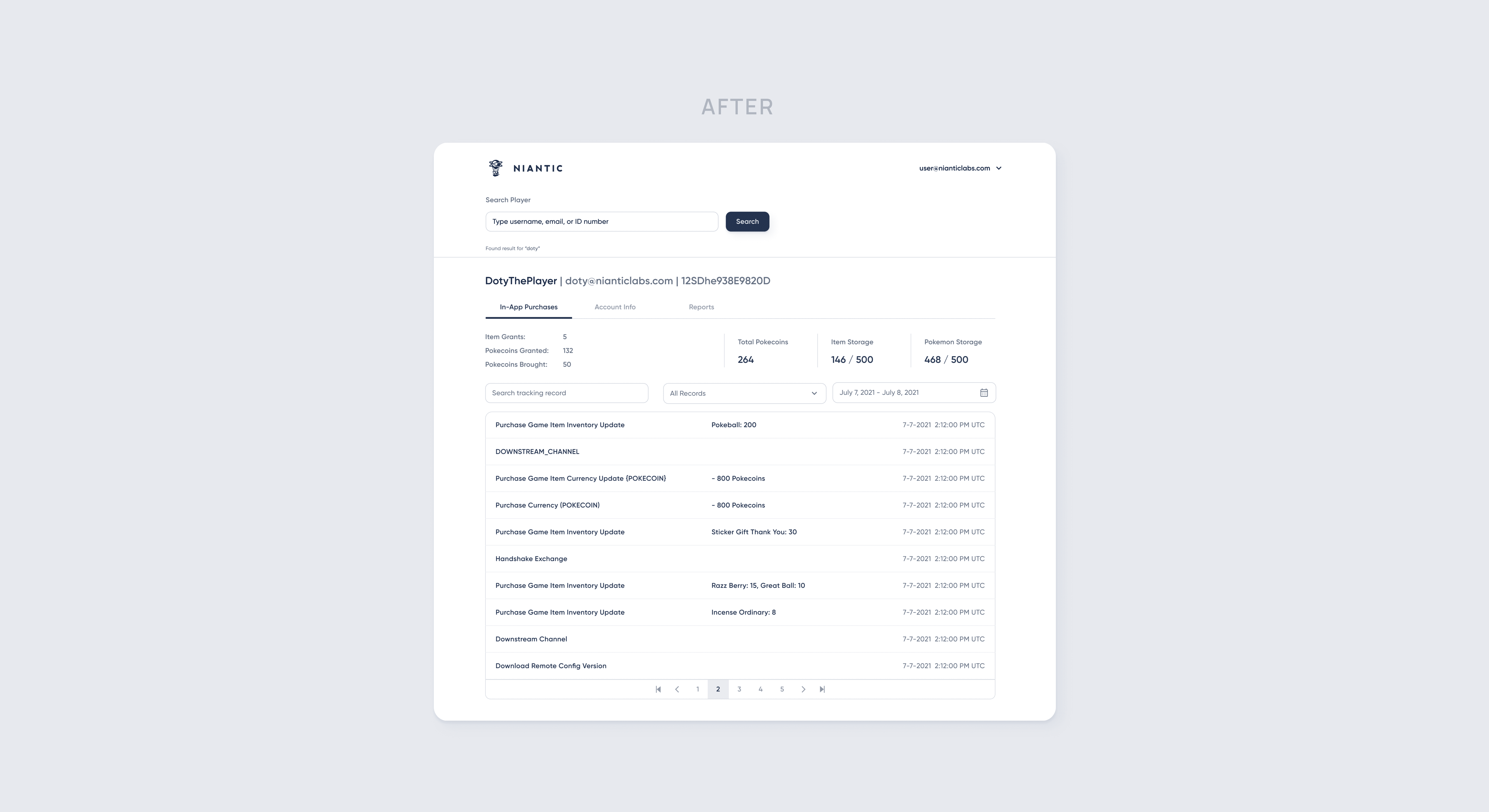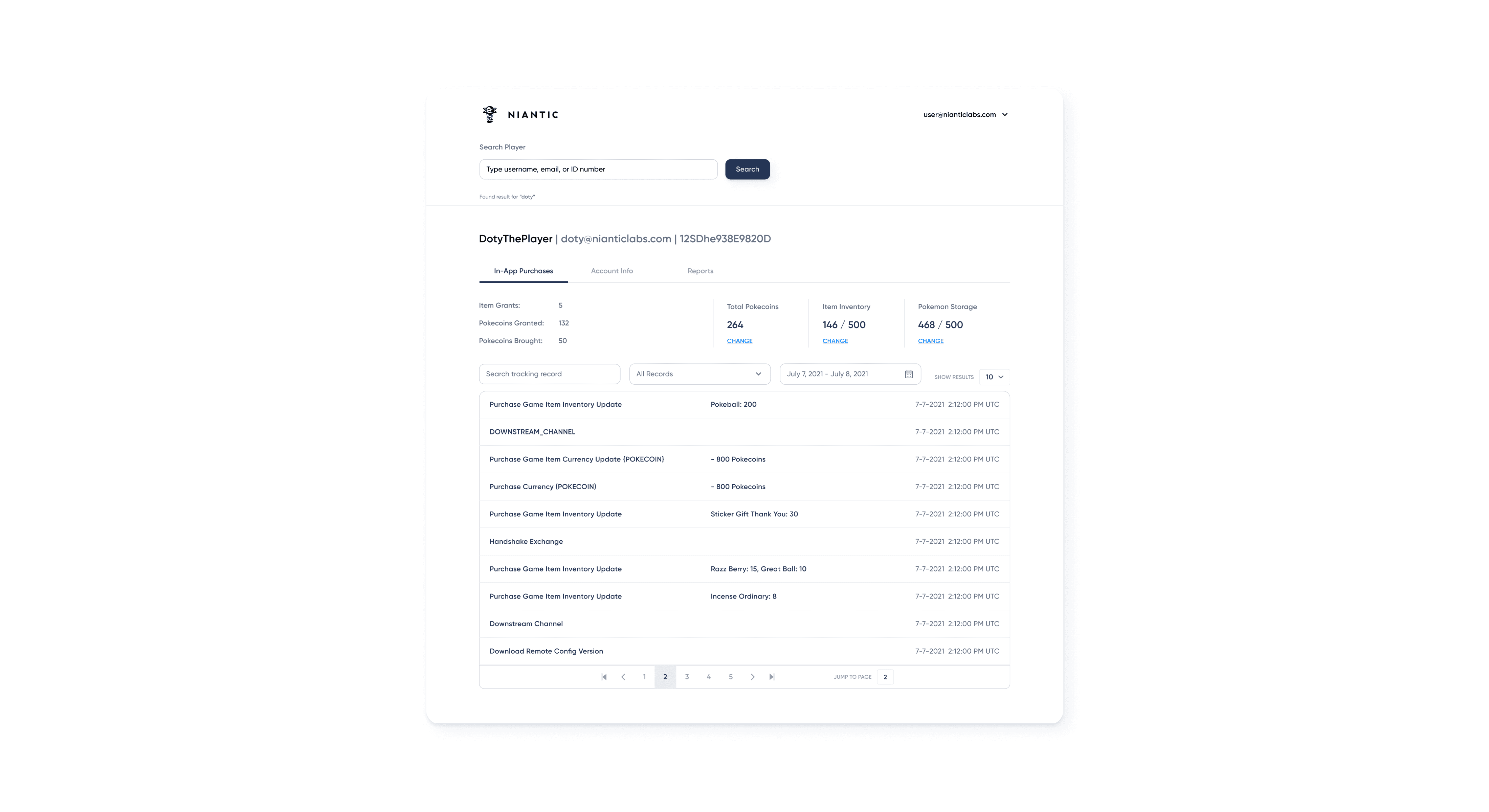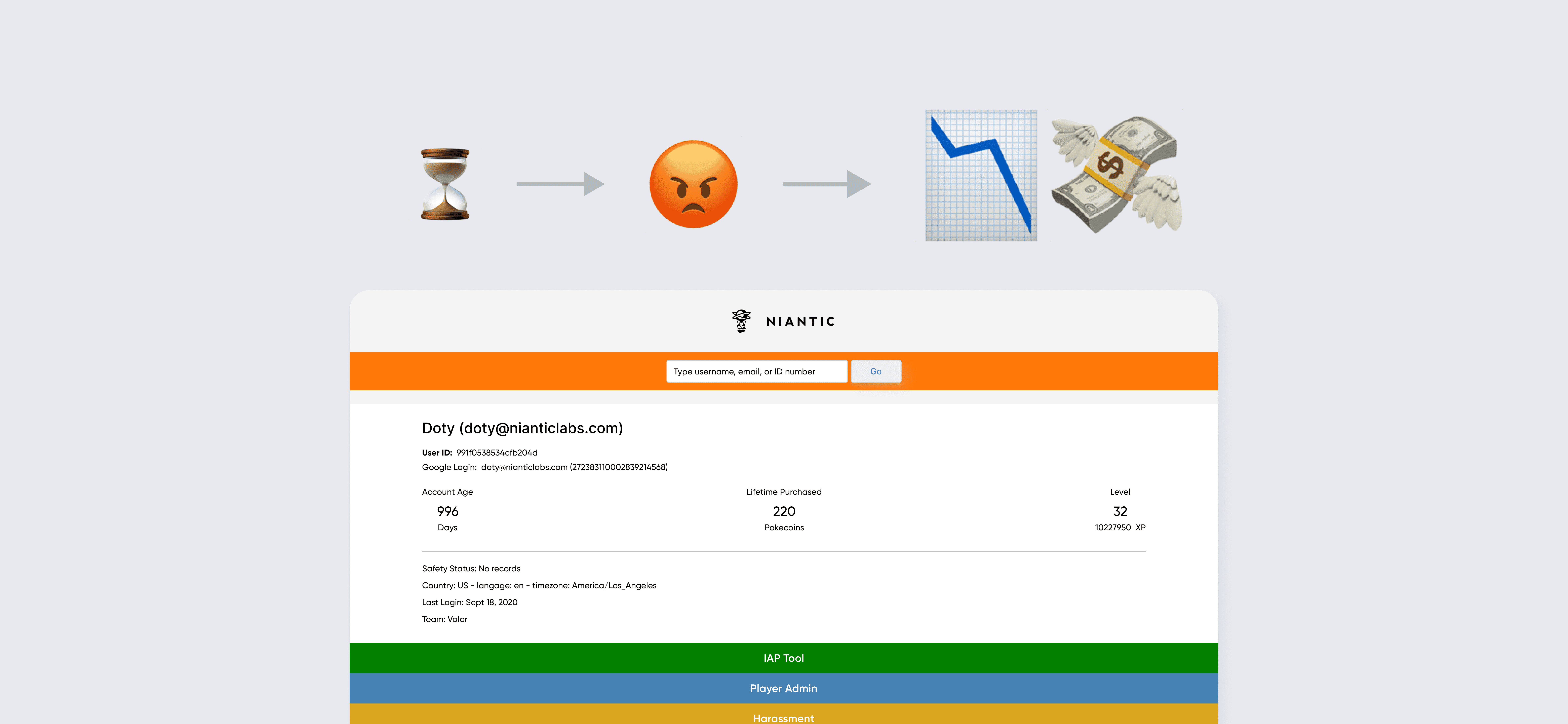 Many Pokemon Go players submit customer support tickets to resolve issues they experienced in their game or account. The customer service team uses an internal CRM tool to help lookup a player's account info. For example, a player submits a ticket claiming their purchase wasn't redeemed. Then a customer service representative uses the CRM tool to look at the player's account, verifying that the player did make a purchase. If purchase was found, the representative can grant the player the in-game item.