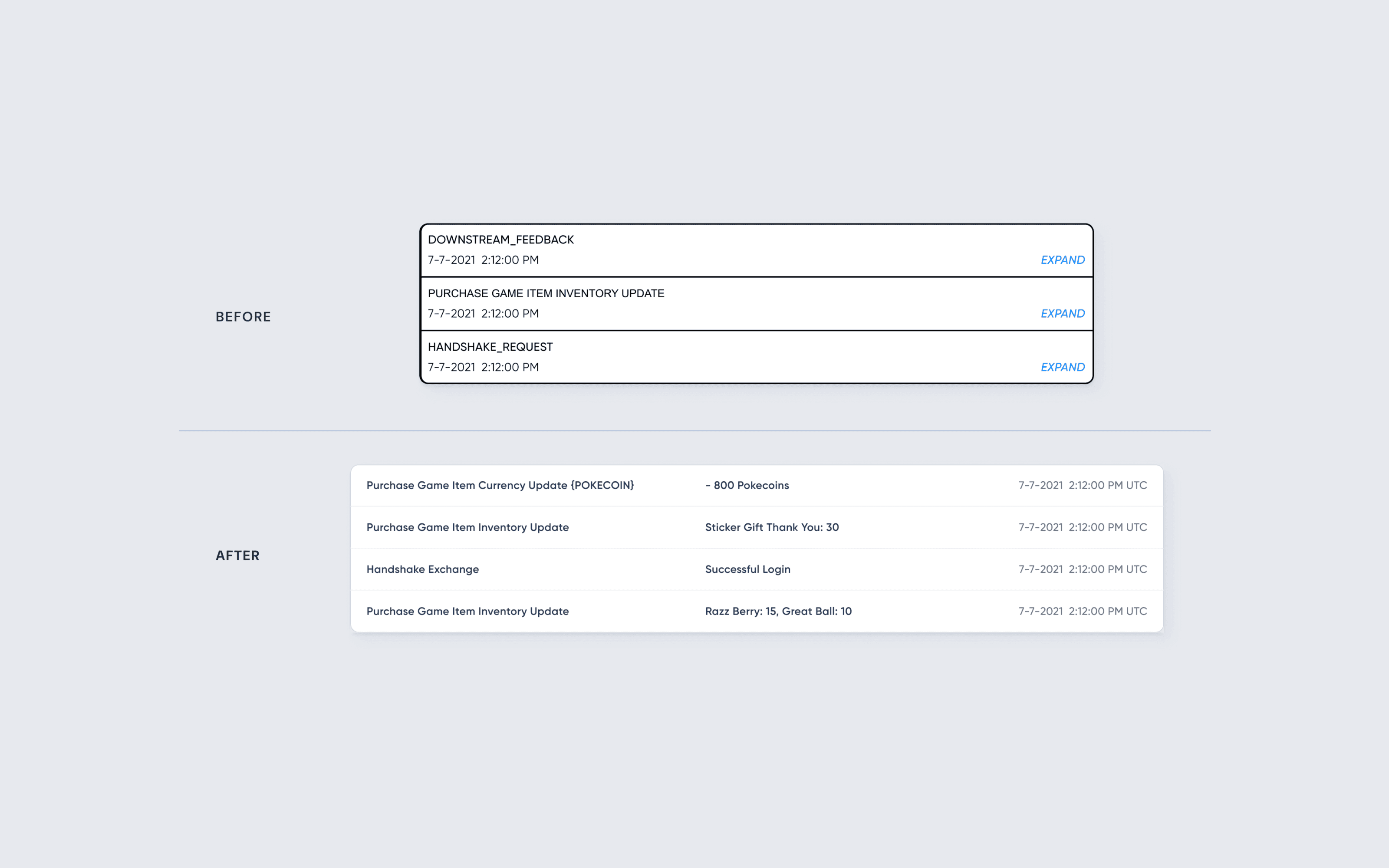 In the old design, the information inside the table item was vague and unhelpful. Often, a user had to click the item to display more detailed and clear info. The lack of useful info prevents the CS from skimming and quickly reading through logs, thereby extending the ticket resolution time. In the new design, I made sure the most important info was displayed, with clear wording on what it is. Thus, allowing the CS team to skim and read through the many logs, cutting down on the ticket resolution time.