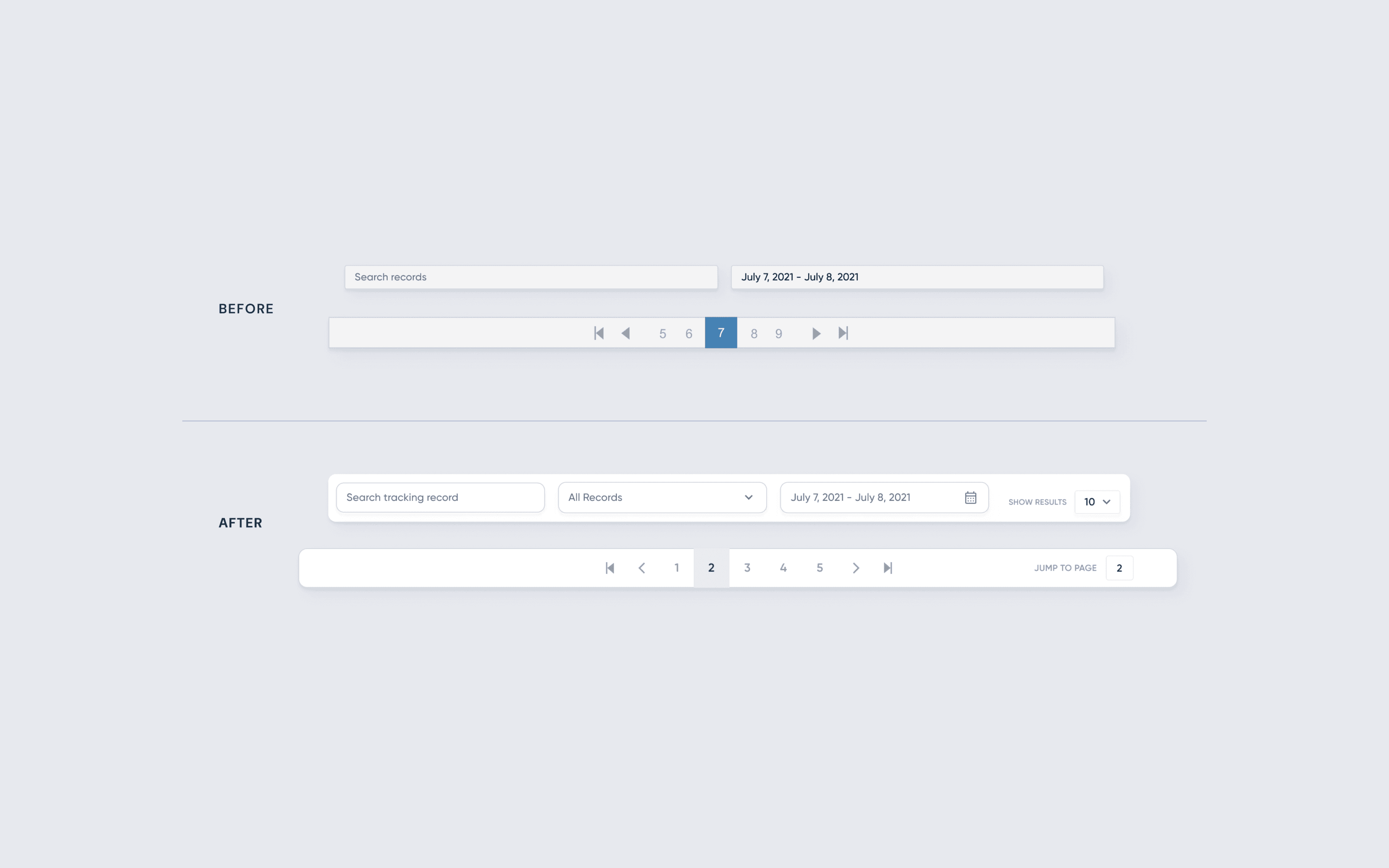In the old design, skipping controls were limited. A user could only skip between the 5 nearest pages and the first/last page. From interviews, these limitations severely slowed down the CS team. In the new design, I created more skipping and searching options. Now a user can search, filter, and jump to pages on the pagination. Thereby, enabling more power to the CS team and faster ticket resolution.